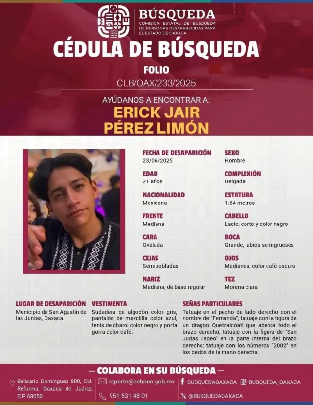 La última vez que vieron con vida a Erick Jair Pérez Limón, un joven de 21 años originario de San Agustín de las Juntas, Oaxaca, fue el 23 de junio. Salió de su casa para reunirse con Gaspar N., el padre de su novia, quien se oponía a su relación. Nunca volvió. Su taxi apareció abandonado en una barranca, pero de él no se ha sabido nada.