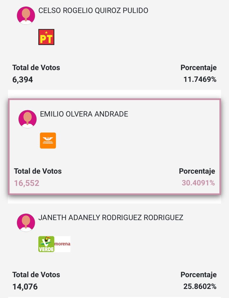 Incluso después de que se anularan más de dos mil votos, la mayoría a favor de MC, el emecista Emilio Olvera mantuvo la ventaja. Jorge Álvarez Máynez, dirigente nacional del partido, celebró en redes: “Con todo y trampas, programas y fraude, ganamos a la buena”.
