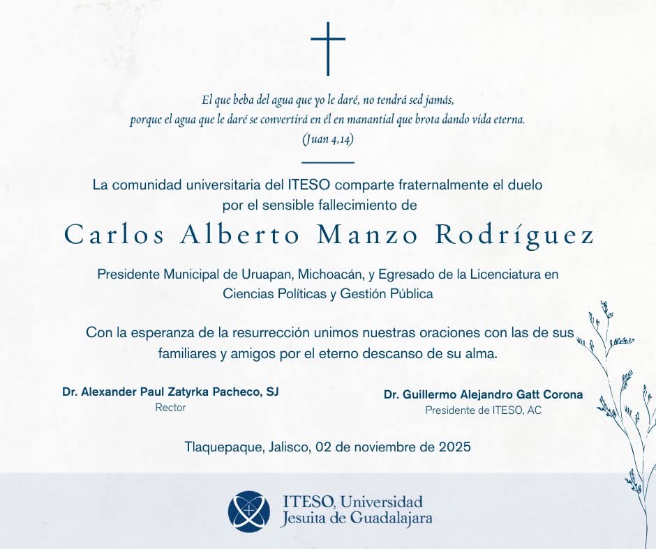 La comunidad del ITESO expresó este domingo su consternación por el asesinato de Carlos Alberto Manzo Rodríguez, presidente municipal de Uruapan, Michoacán, y egresado de la Licenciatura en Ciencias Políticas y Gestión Pública de esta casa de estudios.