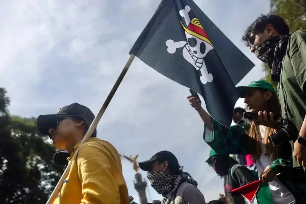 La protesta avanzó entre consignas y símbolos juveniles, como la bandera pirata del manga One Piece, que en los últimos años se ha convertido en un emblema de movilizaciones estudiantiles alrededor del mundo.